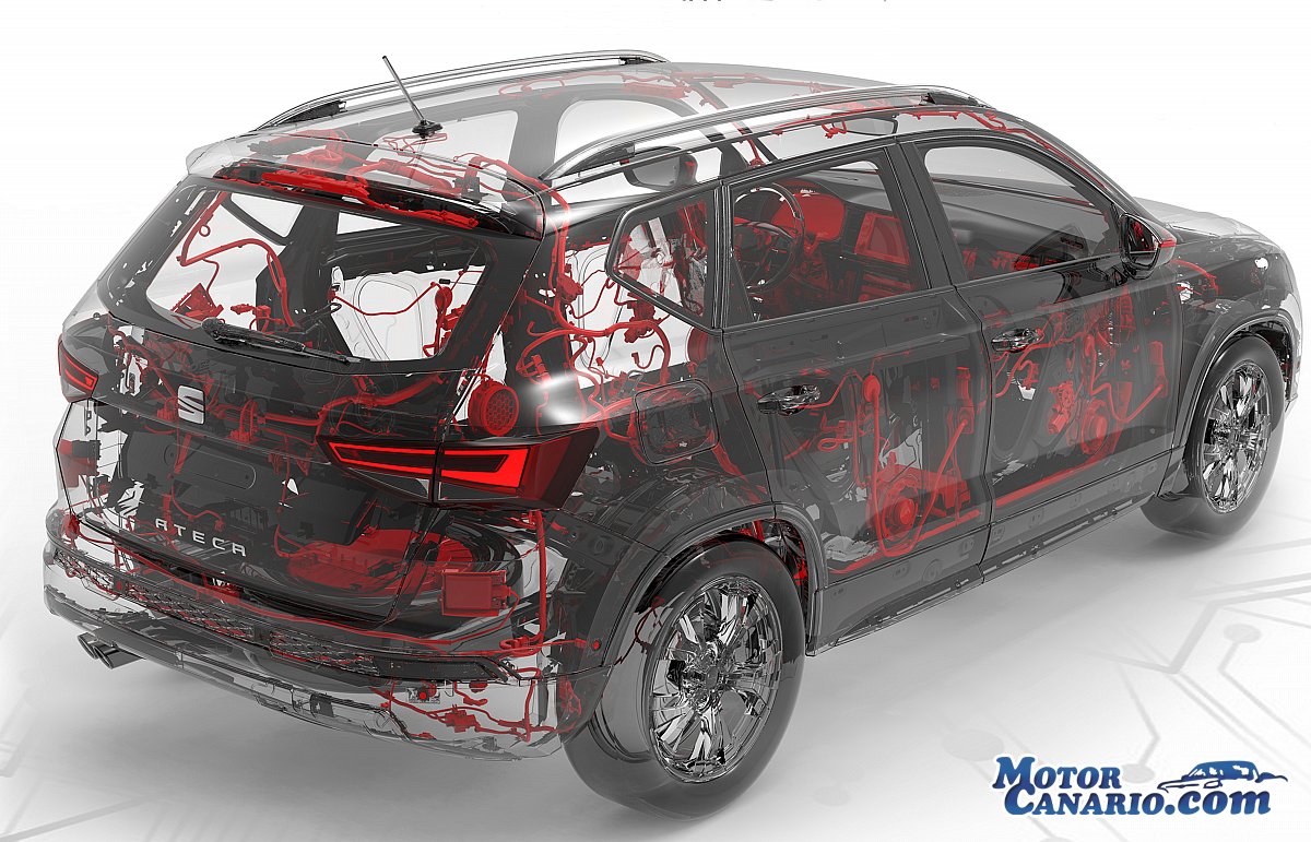 - Una red eléctrica que dibuja su silueta: Modelos como el SEAT Ateca tienen más de 1.350 cables que, puestos en línea recta, recorrerían más de 2.200 metros, una longitud similar a la de una pista de aterrizaje. Se ramifican en más de 30 circuitos que “garantizan la práctica totalidad de funciones que tiene un coche y trasladan la energía de un lugar a otro, como ocurre con la sangre que circula por el organismo”, asegura Pedro Manonelles, ingeniero del Centro Técnico de SEAT. La parte del tablero frontal es la zona del vehículo donde se concentra más cableado. Por aquí llegan a pasar más de 200 cables formando ramales de más de 4 centímetros de grosor.